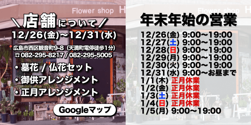 年末年始期間中の店舗営業日時、ネットショップの受取指定日、アフターブーケ(保存加工)のご案内についてお知らせいたします。